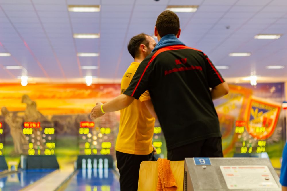 Etwas aufregender ging es bei den Männern zu, als Daniel Aubelj (KV Eppelheim/Baden) 1017 (Vortag 994) und Marvin Bischler (KV Hemsbach/Baden) 1028 (Vortag 972) zu früher Stunde vorlegten und sich vier bzw. sechs Platzierungen gutschrieben. Während Manuel Mahler (KV Hemsbach/Baden) von den letzten Sechs mit 957 (Vortag 1042) nicht ganz an seine eigene Vorlage anknüpfen konnte und seine dritte Platzierung aufgeben musste, entbrannte anderweitig ein heißer Fight um die vorderen Plätze. Konstante 1013 (Vortag 1015) bescherten Torsten Depta (SG Frankfurt-Bockenheim/Hessen) Platz vier mit 30 Kegeln Rückstand auf eine Medaille. Mit 1046 (Vortag 1013) forderte Christian Cunow (KV Sandhausen/Baden) seine vier Vorplatzierten heraus und egalisierte schlussendlich 35 Kegel Rückstand auf den Vize Tobias Woll (KV Sandhausen/Baden). Mit einem Kegel und 1010 (Vortag 1048) musste sich dieser seinem Vereinskollegen geschlagen geben und bewahrte sich Bronze. Gleichzeitig wehrte Pascal Jestädt (KV Pirmasens/Rheinhessen-Pfalz) mit 1018 (Vortag 1058) die Offensiven ab und nutzte sein Guthaben zur Verteidigung des ersten Platzes.
